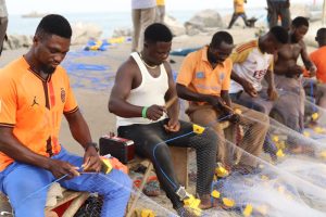 Fishermen mending net, Canoe Basin, Tema. Train more members in data collection and prioritize fishers’ participation in data collection to support the implementation of fisheries co-management in Ghana’s artisanal fisheries sector is the next action plan. Photo Credit: CaFGOA G Secretariat