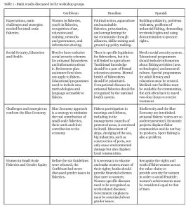 The fundamental rights of fishers include the right to land, social development and decent work, along with women’s rights, a transversal theme of the workshop. The main topics discussed at the workshop are summarized in Table 1.