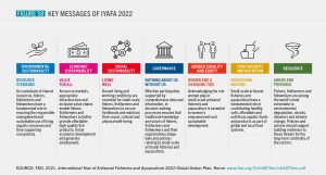 The United Nations designates specific days, weeks, years and decades as occasions to mark events or highlight topics to promote, through awareness and action, its developmental objectives.25 In 2018, the United Nations General Assembly declared 2022 the International Year of Artisanal Fisheries and Aquaculture (IYAFA 2022) and nominated FAO as the lead agency for celebrating the year in collaboration with other relevant organizations and bodies of the United Nations (United Nations, 2018). The world faces many complex challenges, including hunger, malnutrition and diet-related diseases, an ever-growing global population that needs sufficient and healthy food and must reduce food loss and waste, and over-exploitation of natural resources, in addition to the effects of climate change and other major issues such as the COVID-19 pandemic. IYAFA 2022 highlights the importance of small-scale artisanal fisheries and aquaculture for food systems, livelihoods, culture and the environment. Given that artisanal fishers, fish farmers and fishworkers produce a significant portion of aquatic food, 24 they can be key agents of transformative change for sustainable use and conservation of living aquatic resources – with positive ripple effects on food systems and nutrition security.