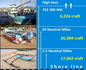 Technological developments during the early 1960s were characterized by the introduction of nylon nets, outboard motors (OBMs), offshore craft with inboard engine, and new fishing techniques such as nylon gill-netting. This was the onset of Sri Lanka’s ‘Blue Revolution’. The new technology did not have serious impacts on the customary rights of small-scale fishers. There was a clear spatial separation of fishing technology: artisanal craft operated up to about five km from the coast; small mechanized craft plied up to the edge of the contiguous zone of 24 nautical miles; and the offshore craft with inboard engine (and, after 1990, the multi-day boats) fished beyond the continental shelf (away from the contiguous zone) up to the exclusive economic zone (EEZ) and further away in international waters. No conflicts among different technological categories emerged and fishers continued to enjoy their customary rights to the sea and fish resources.