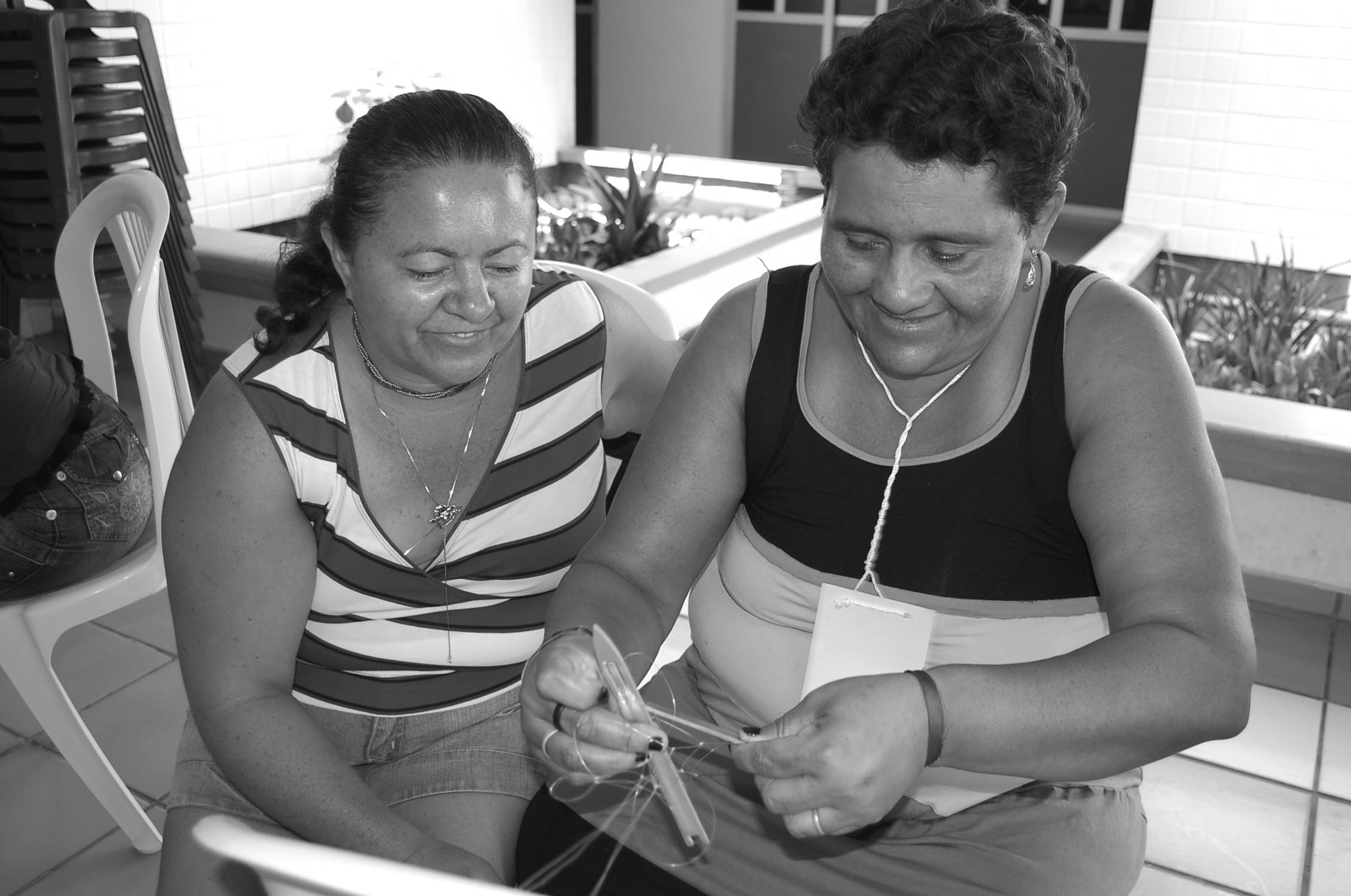 Bina, an algae collector and Lourdinha, a fish seller, from Batoque (east littoral) during the net weaving workshop.
