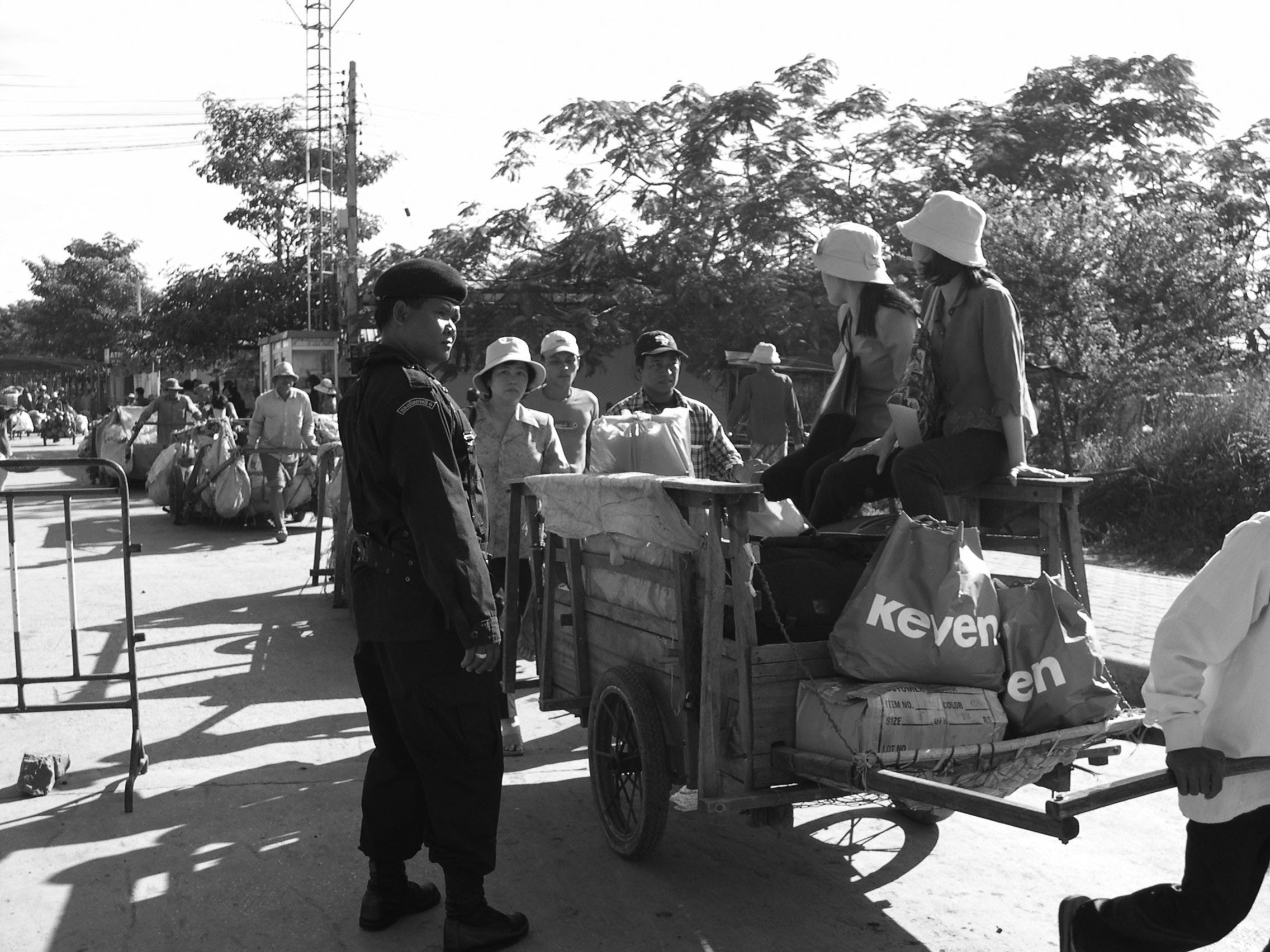 Women fish traders transporting fish on carts from Cambodia to Thailand.