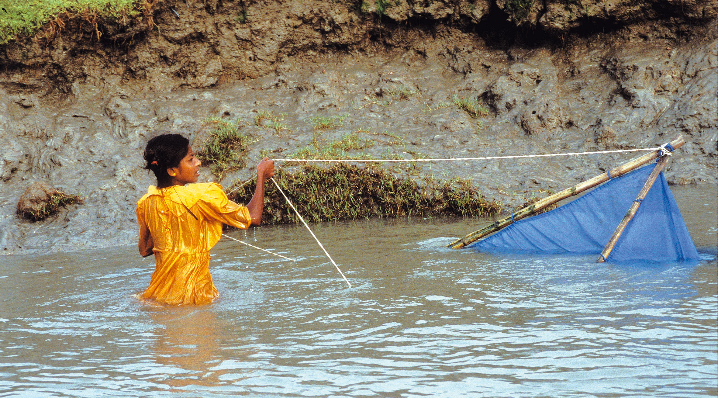 Long hours, little money. A girl collecting fry in the Sundarbans, West Bengal, India.