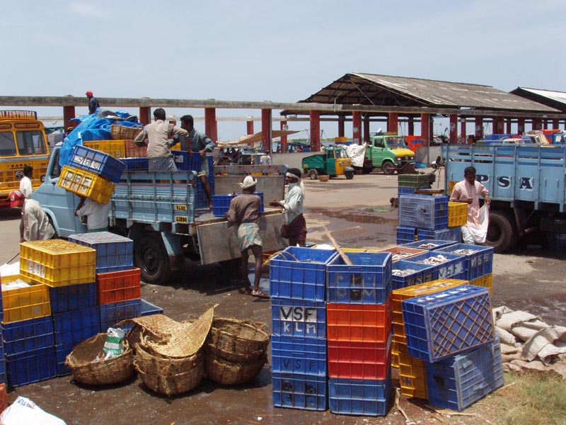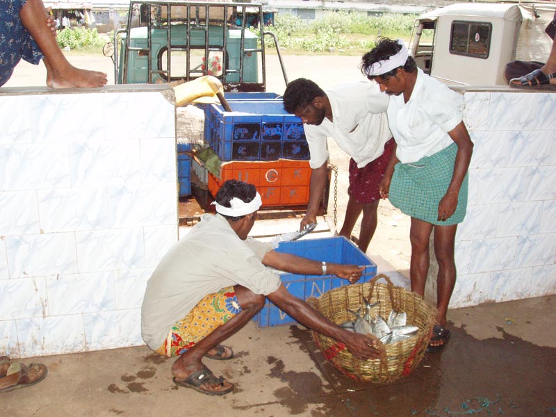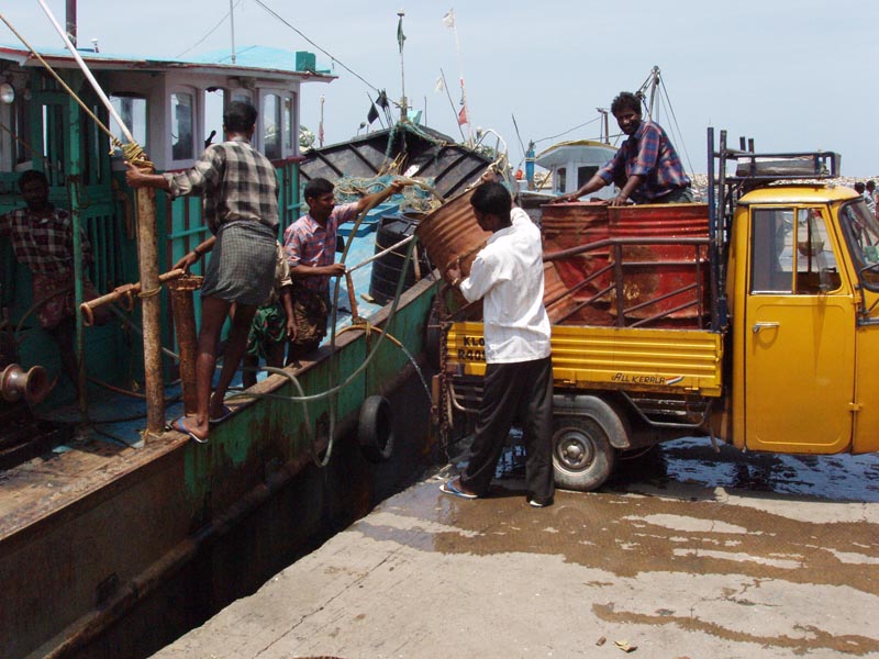 Fishermen loading fish at Neendakara fishing harbour in Kerala, India