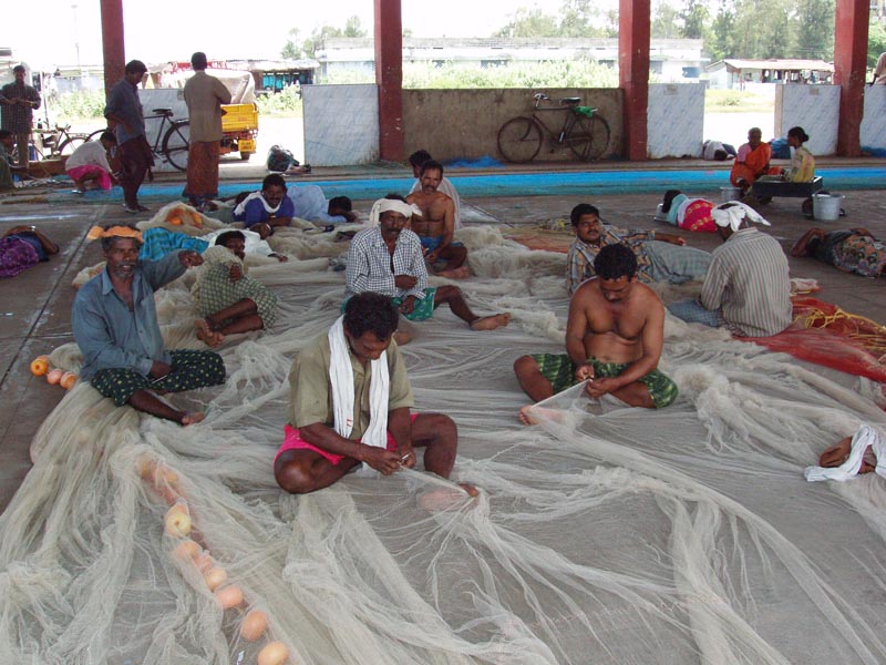 Net mending at Neendakara fishing harbour in Kerala, India
