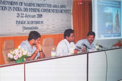 Manish Chandi, B. C. Choudhury and Deepak Apte during the presentation of case study on Agatti Conservation Reserve, Lakshadweep and an overview on communities and MPAs in Andaman and Nicobar islands, 21-22 January 2009, Chennai, Tamil Nadu, India