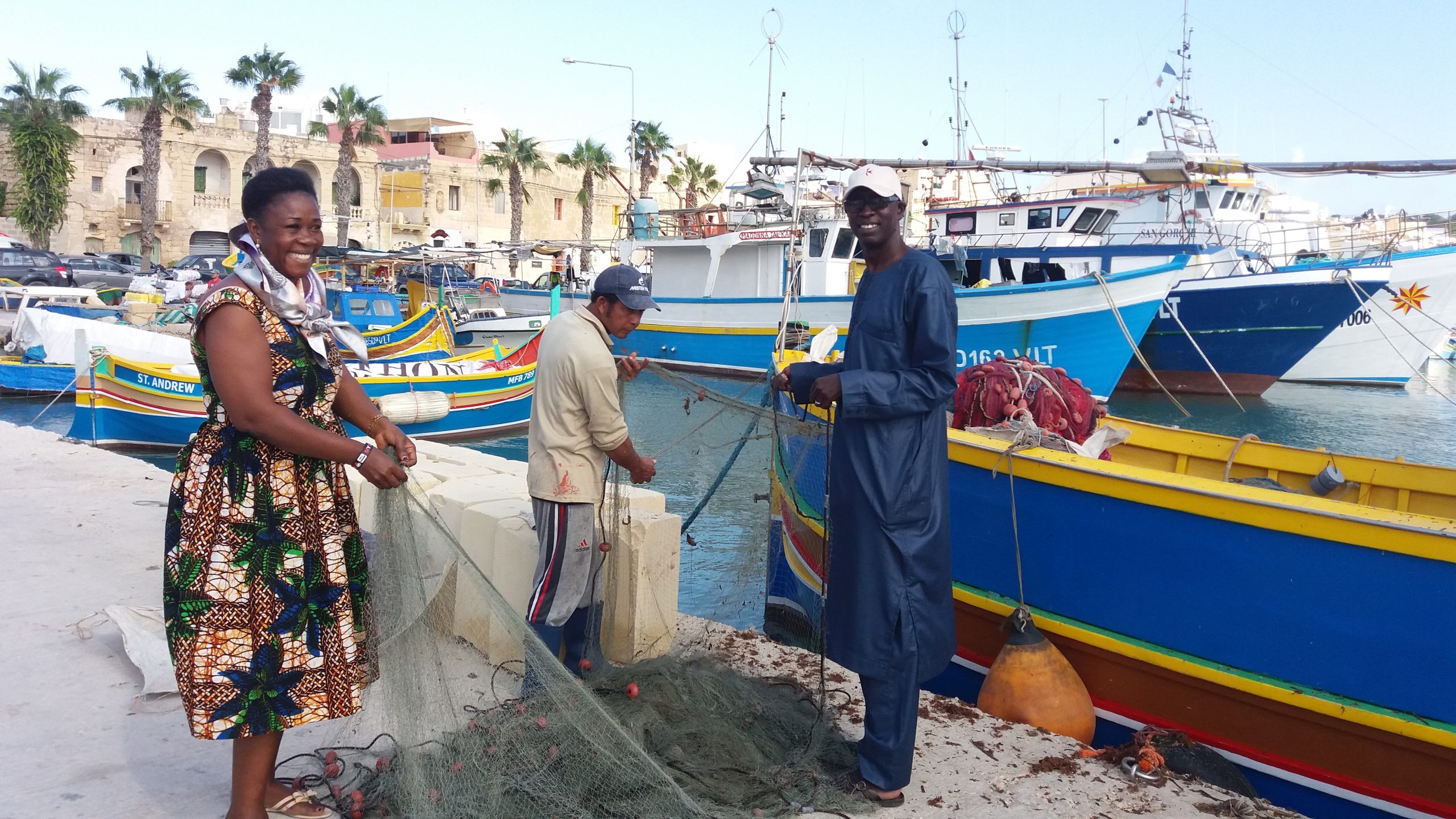 Lending a hand: African Confederation of Artisanal Fishing Organizations' (CAOPA) delegates with Maltese fishers at Marsaxlokk fish landing centre, Malta. Small-scale fisheries are the first to feel the pain of collapsing resources and therefore, it is important to build the future with them.