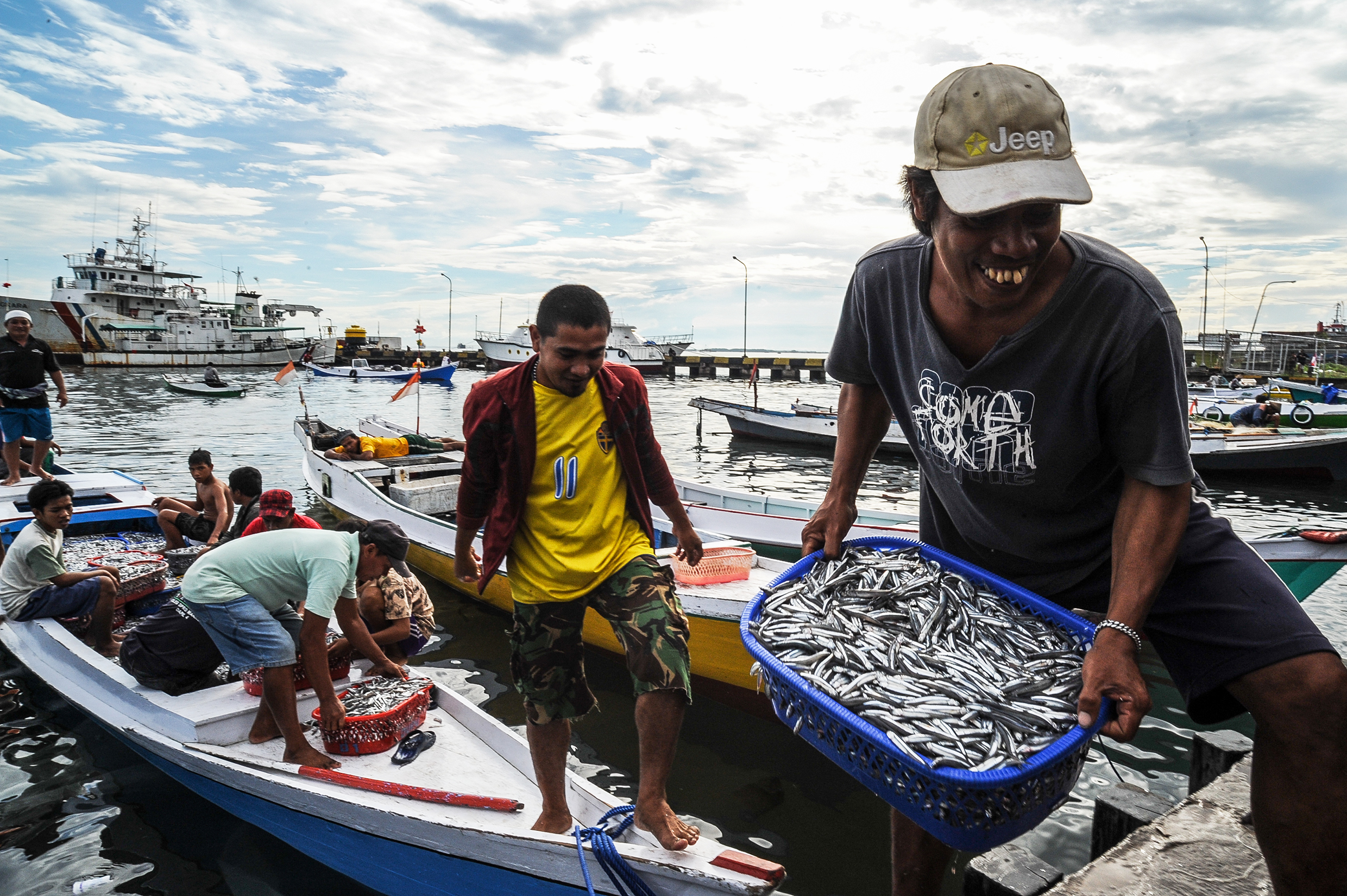 Fishermen unloading buckets of fish from their boats in Makassar, South Sulawesi, Indonesia. Some fish are going to disappear because of over-exploitation from catch-based quotas.