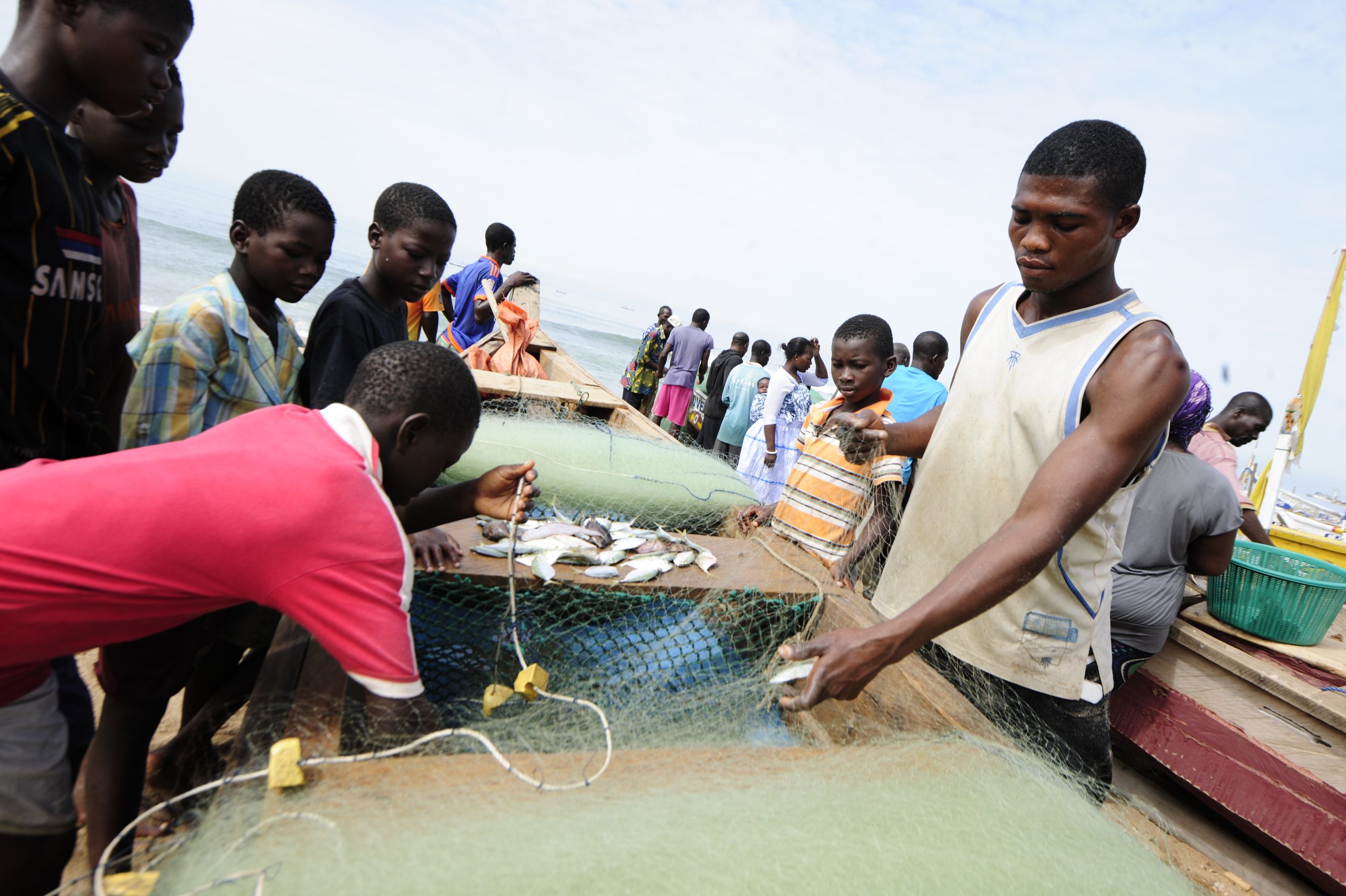 Landing of the catch, Prampram, Ghana and in fisheries, child labour and trafficking occurs across the entire value chain, from downstream to upstream activities.