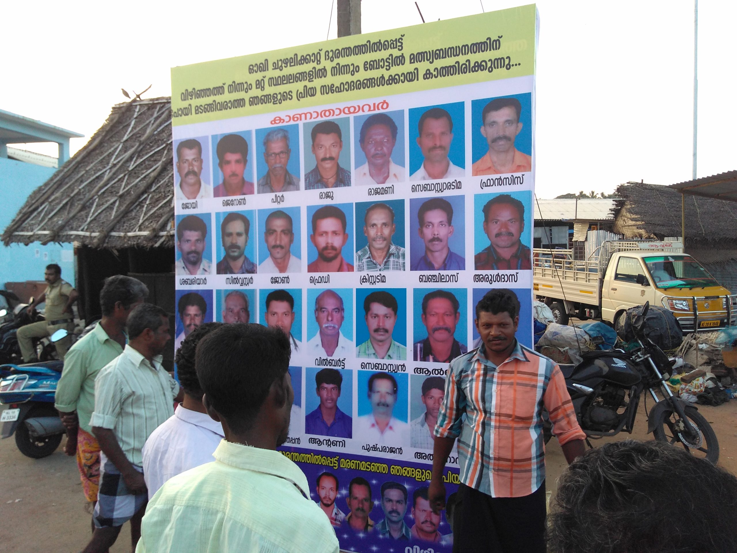 A poster in Vizhinjam, Kerala, India, identifying fishermen from the village still missing after the cyclone.