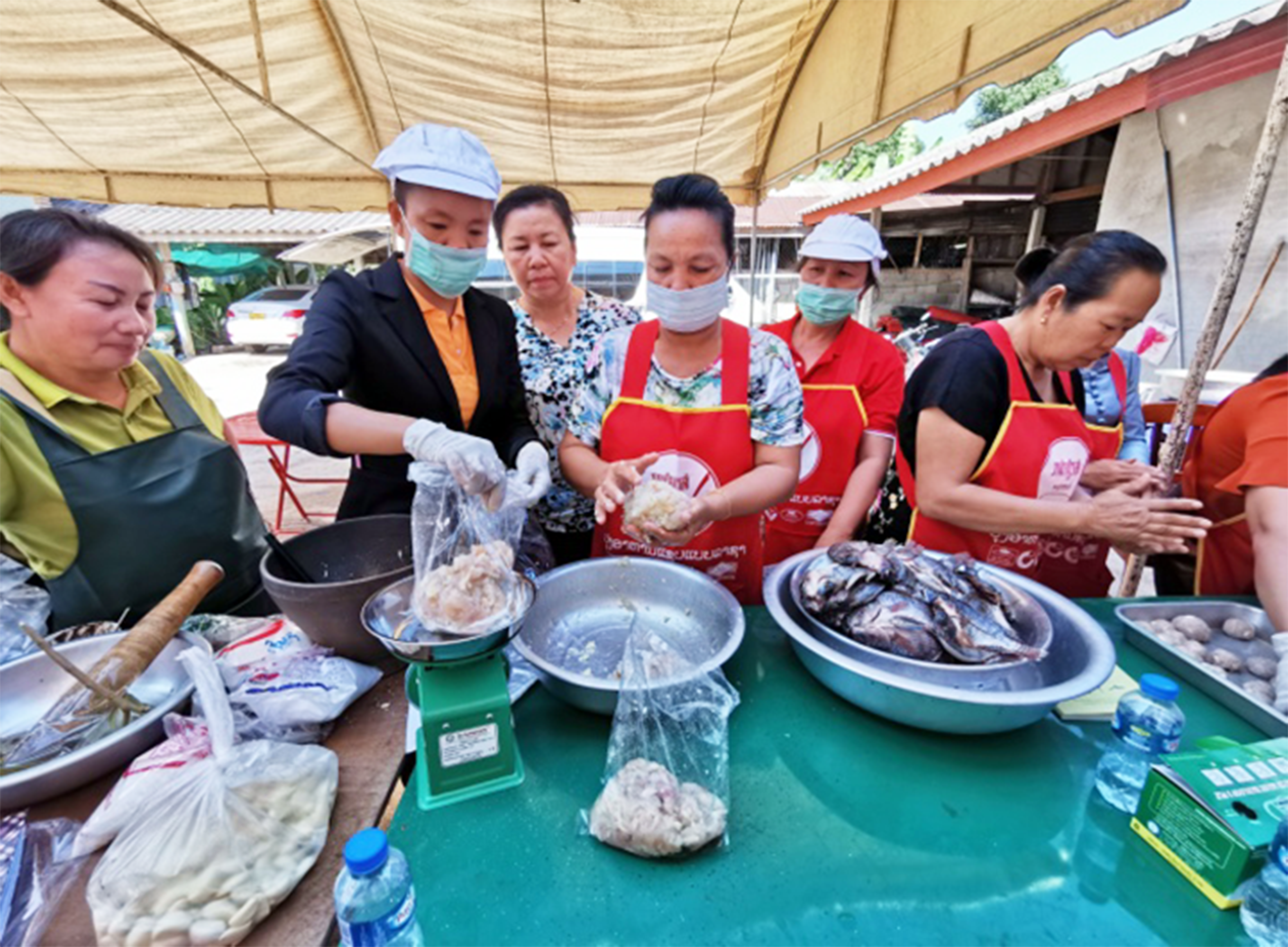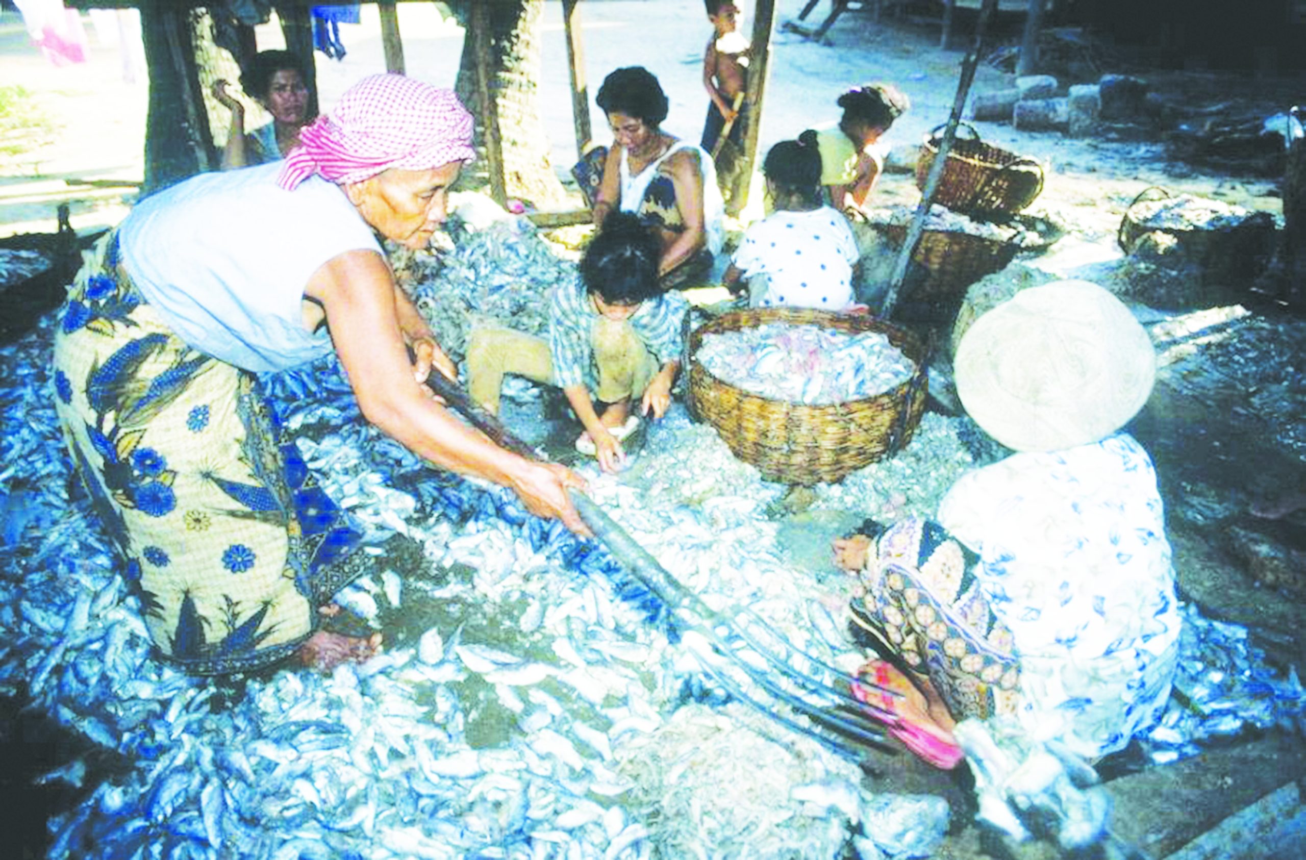 Fish processing group in Namxouang reservoir, Lao PDR. The processing group helped to promote women’s empowerment, contributing much-needed incomes to households and communities.
