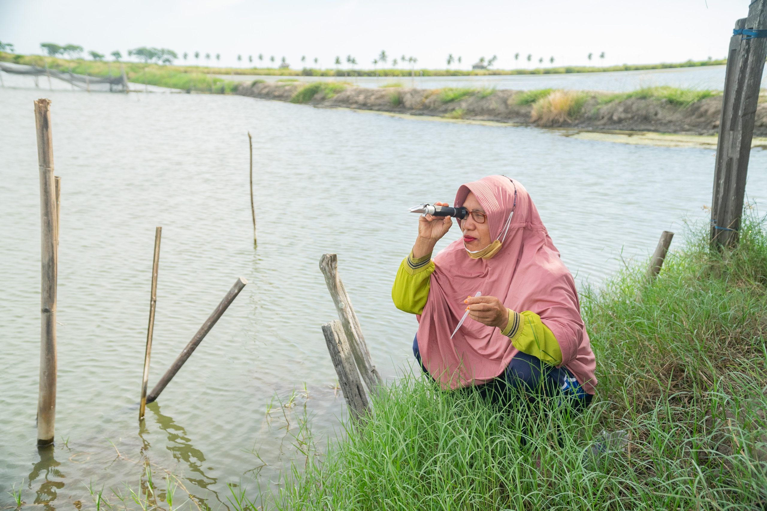 Hasmia, a shrimp farmer in Pinrang, South Sulawesi, Indonesia is checking the salinity in her pond to ensure optimal growing conditions.