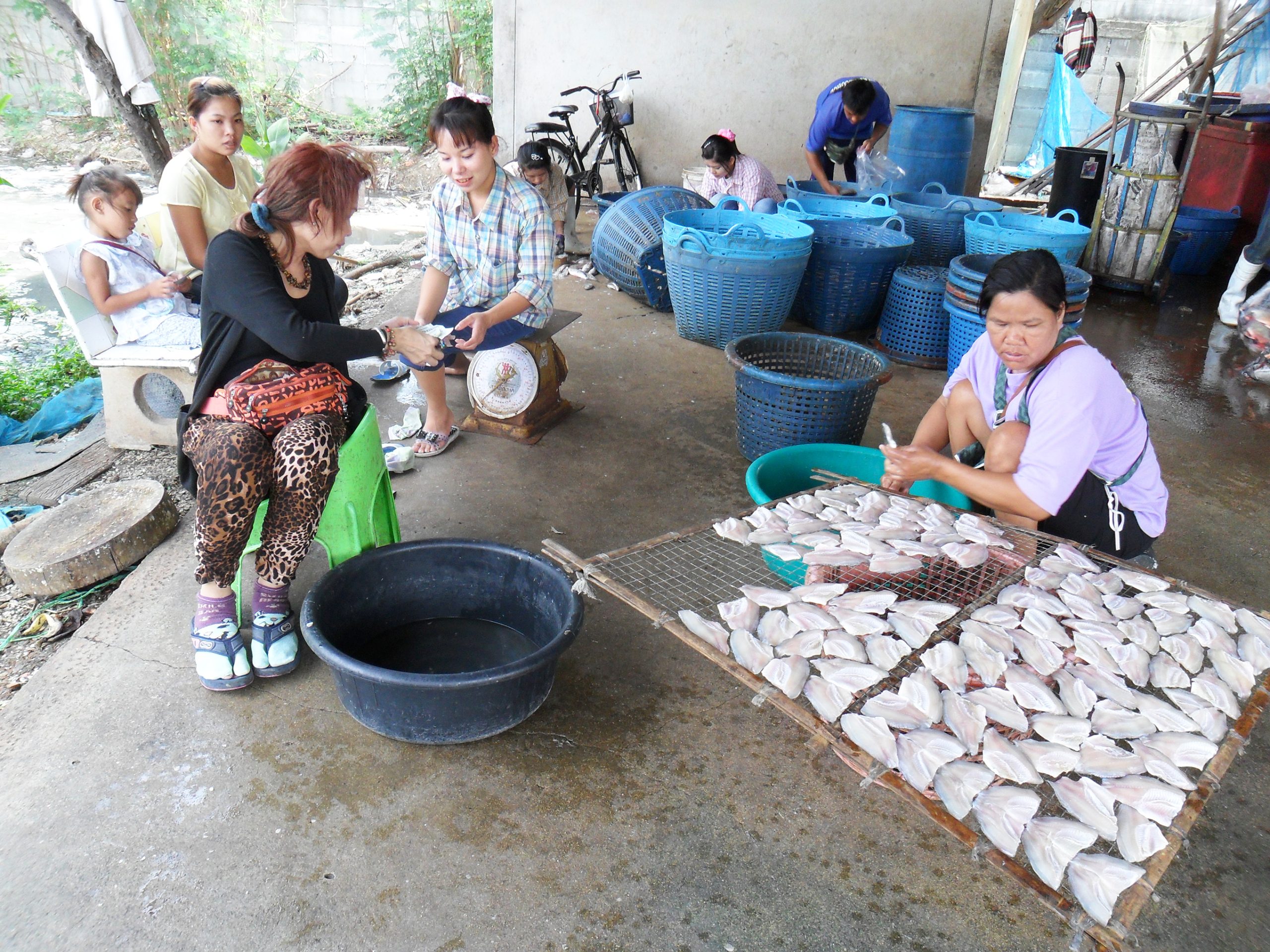 Fisherwomen at work. Work such as fish processing factory jobs, attracts people from poorer areas with fewer economic opportunities. Thais from rural and poor farming areas come for factory work near cities.