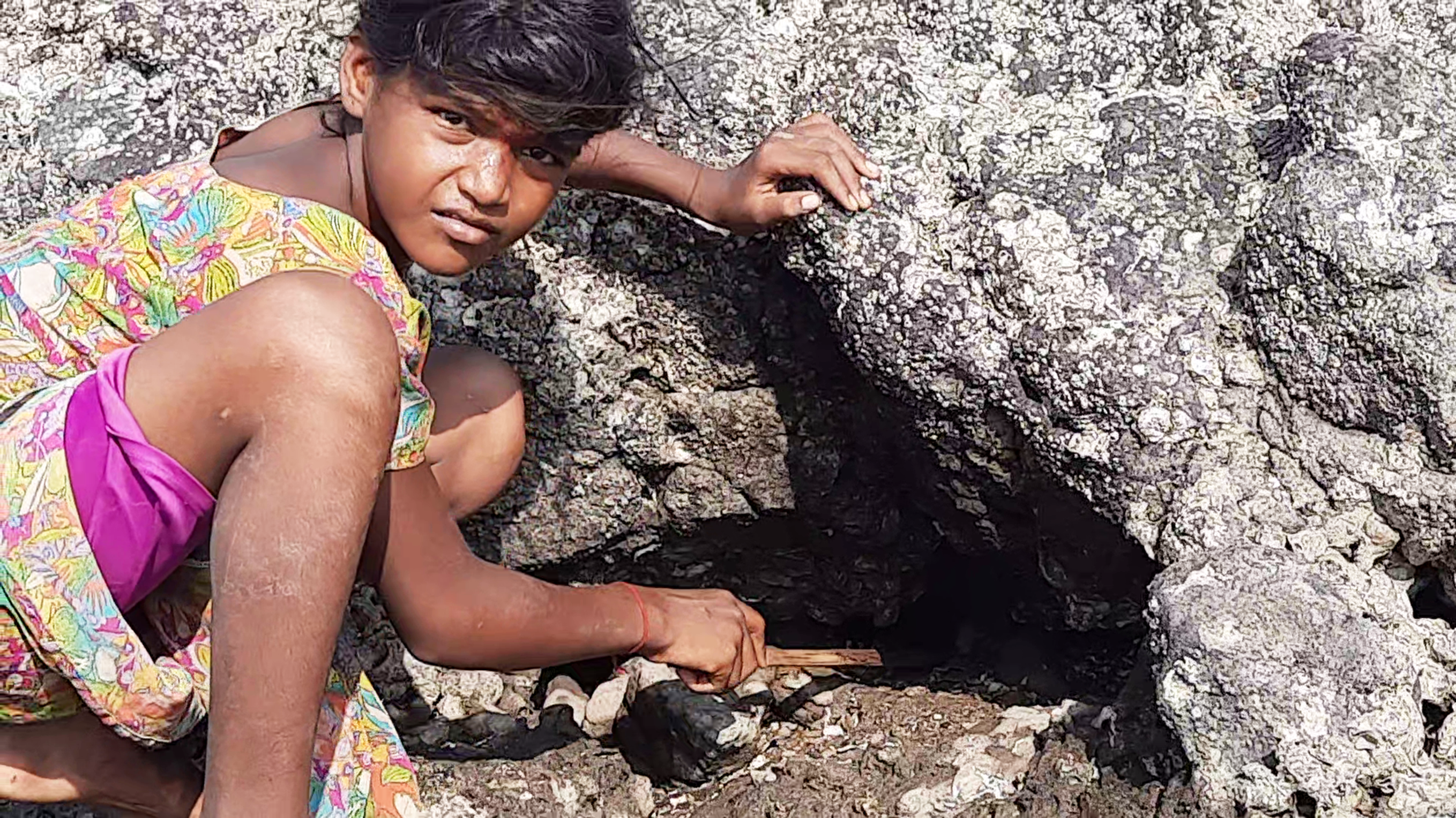 Maneesha, teenager from the Katkari tribe crabbing to feed her family Karanja creek rocky shore, Raigad, Maharashtra, India. The main challenges contributing to poor incomes from fishing were poor infrastructure, lack of ice, limited local market facility, and poor transportation.