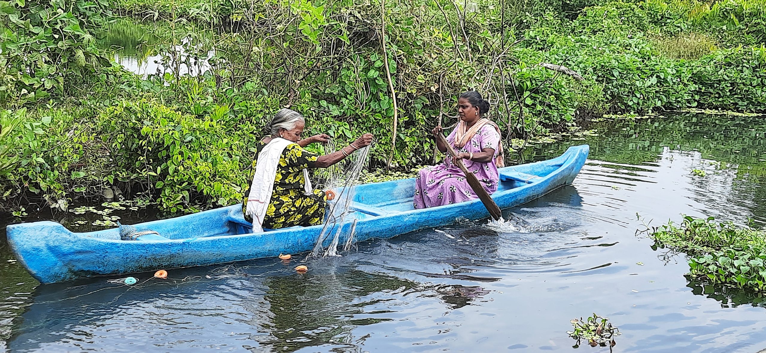 Gillnet fishing by inland fisherwomen at Valanthakad fishing village, Vembanad lake, Kerala, India. A major challenge to the availability of fish and fishery-based incomes in the estuary is the growing pollution of local water bodies.