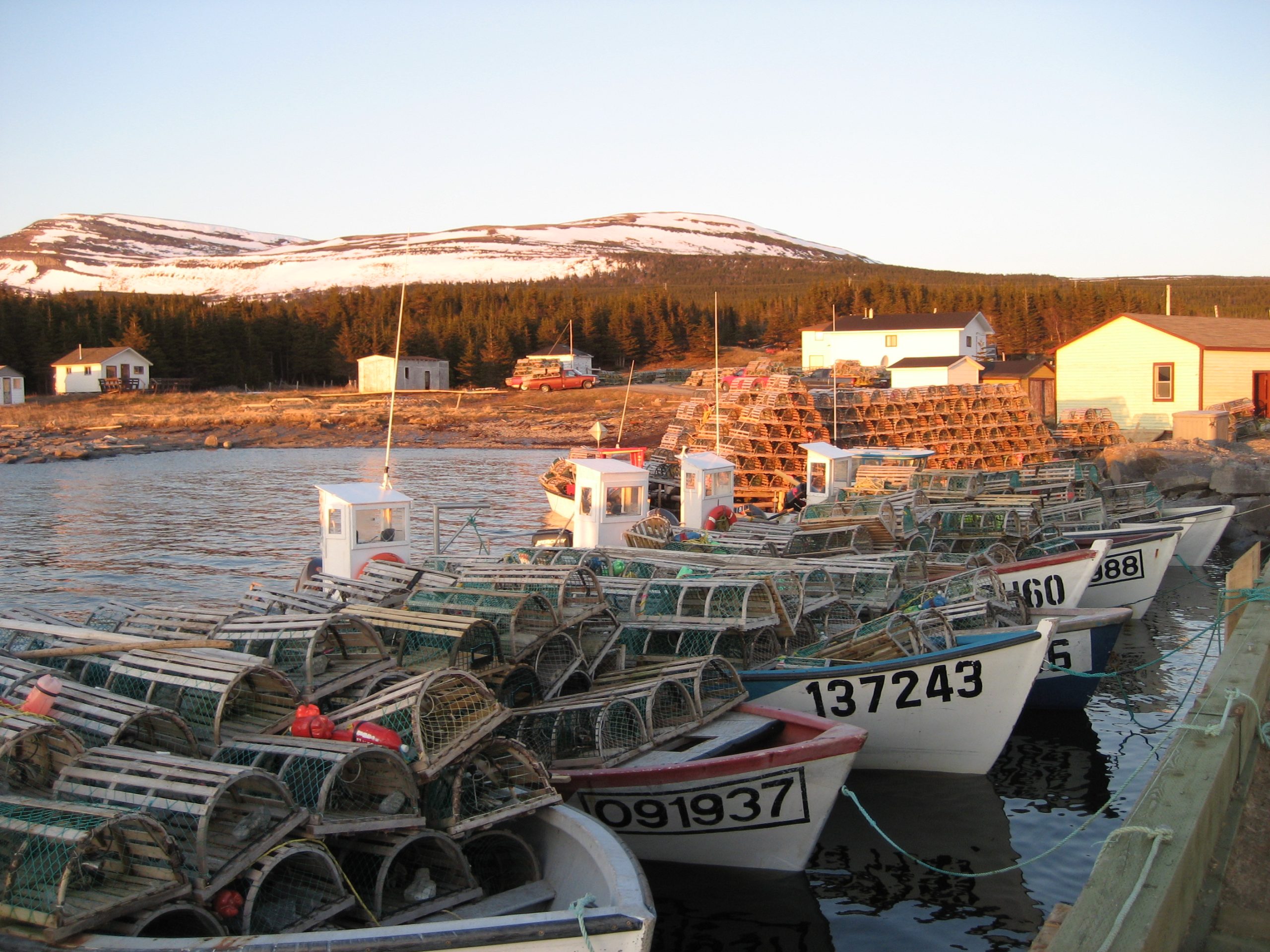 Small boats loaded up for setting out to sea on the first day of the lobster fishing season in Newfoundland.