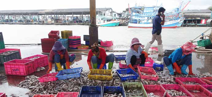 Cambodian women migrant fishworkers sorting fish in Thailand. In Southeast Asia, there is very little organizing among fishers, probably because many fishers in this region combine farming and fishing and there are few full-time fishers.