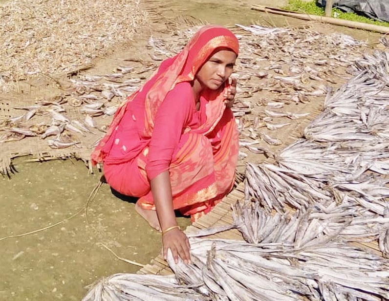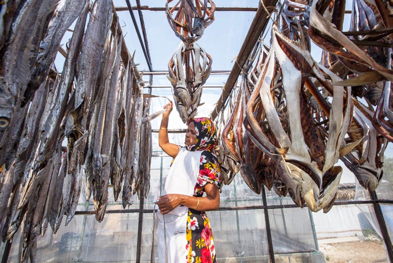 Woman in a dry fish plant at Cox’s Bazar, Bangladesh. Around 70 per cent of women fishers are involved in different support activities, including drying fish, and net making. The low involvement of women in income generation hinders their empowerment and financial self-reliance in Bangladesh society.