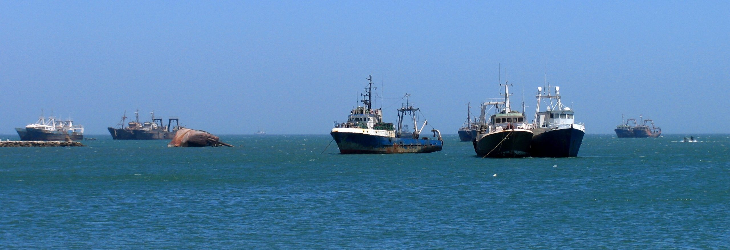 Industrial fishing vessels anchored off Nouadhibou harbour, Mauritania. Overcapacity in Mauritania's fisheries is a direct consequence of the financial requirements of the government.