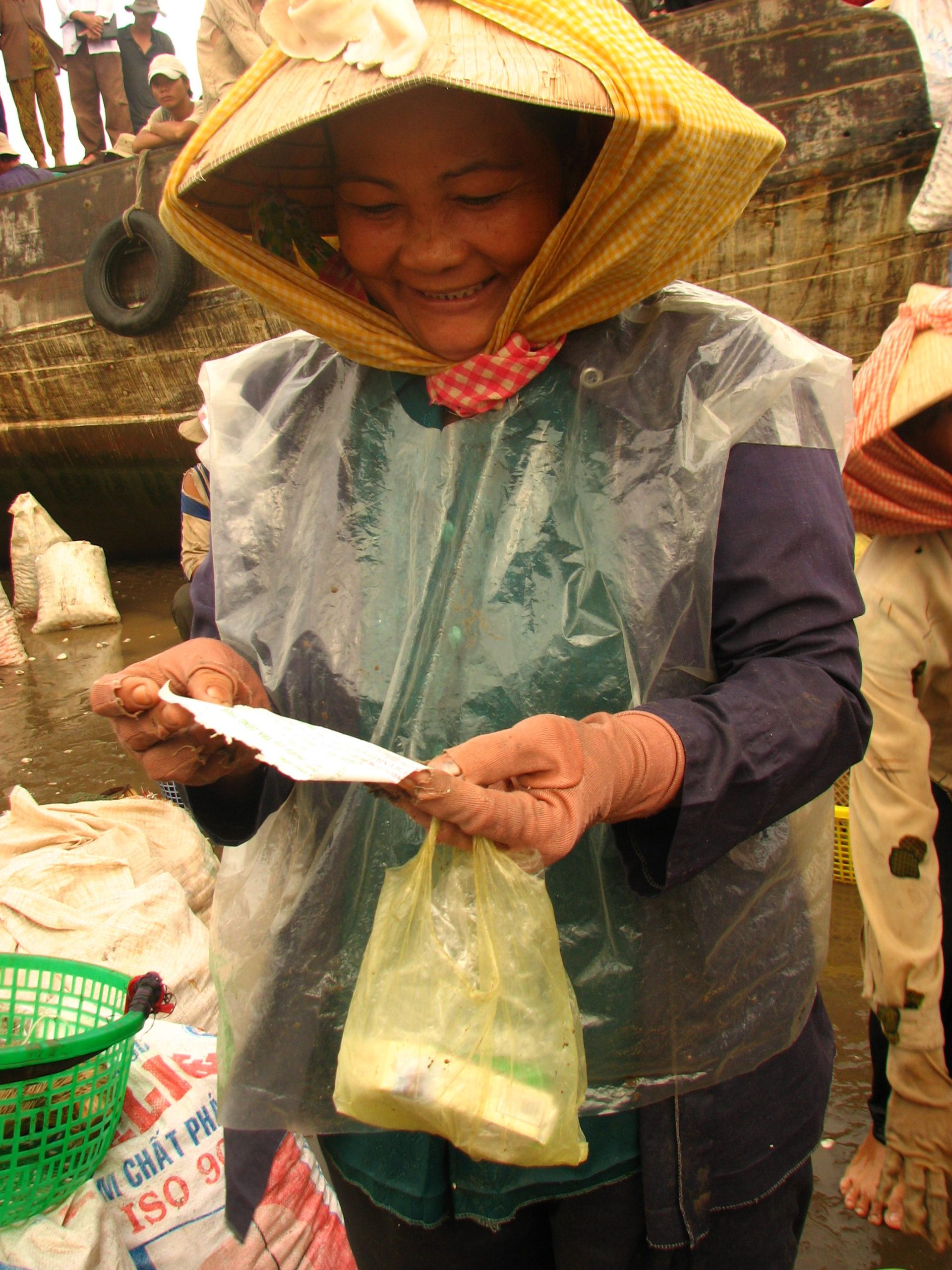 A member of a fisheries co-operative in Vietnam displaying her certificate for verification of payment.