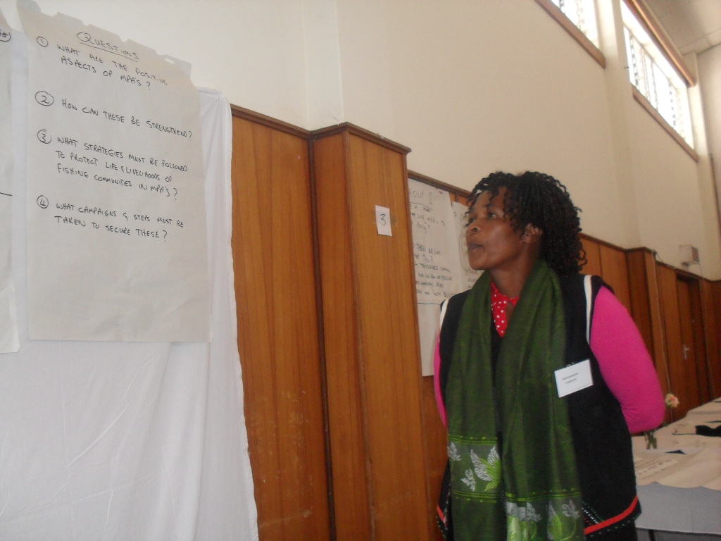 A participant at the workshop shares her group's feedback on the key issues facing small-scale fishing communities living in, or adjacent to, MPAs.
