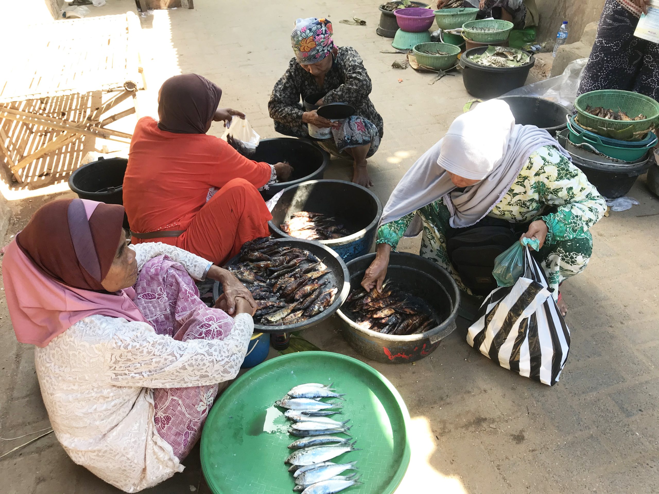 A smoked-fish seller at the Gapura Market, Gapura District, Sumenep Regency. Several artisanal methods are used in processing fish due to limited cold storage in the local fish supply chain in rural Sumenep. Photo Credit: Kyana Dipananda