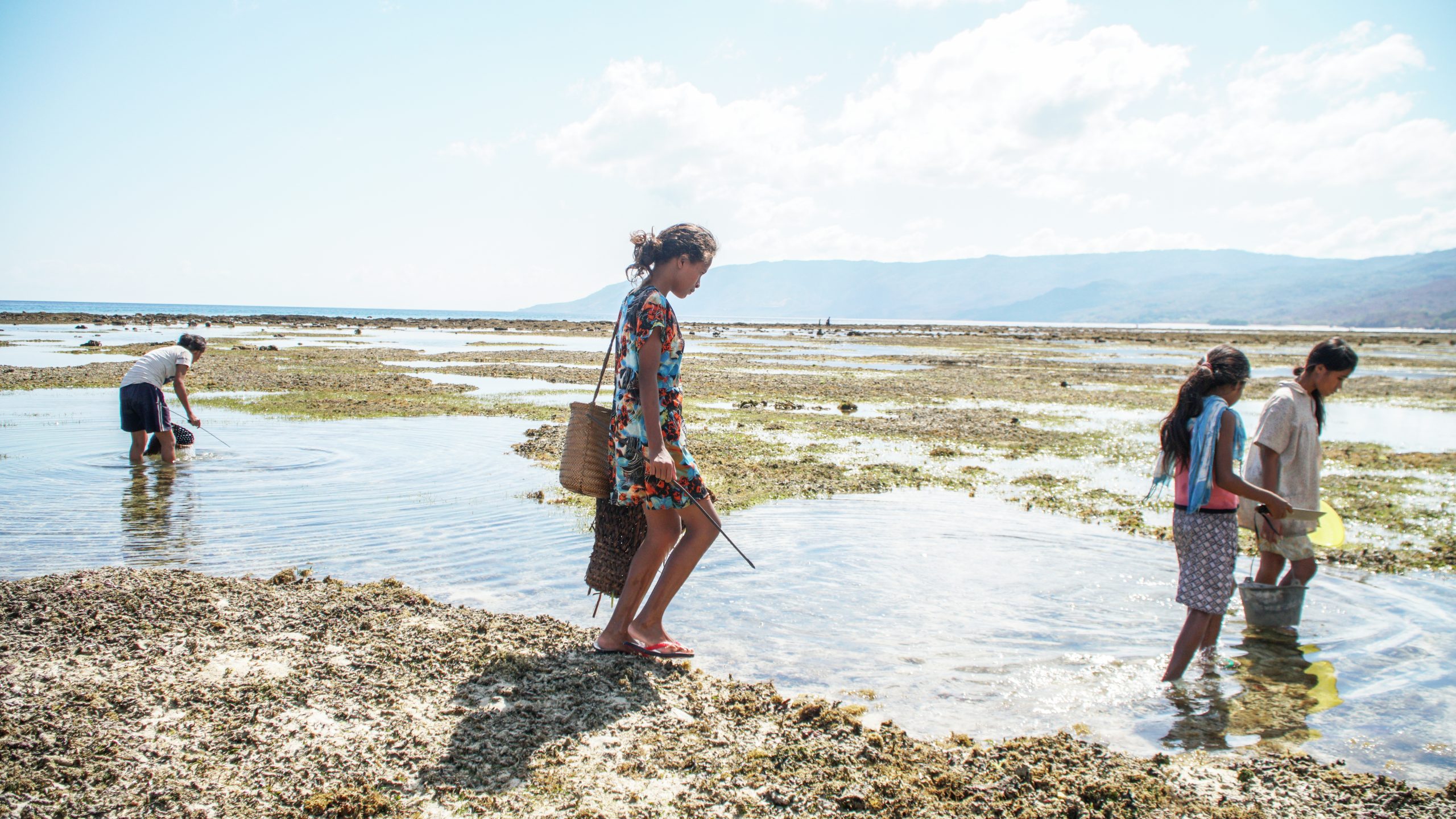 Timorese girls gleaning along the shore. Women and children catch and collect molluscs, crabs, seaweed, fish and octopi found in the intertidal zones, mangroves and other shallow habitats at low tide. Photo Credit: J. Dos Reis Lopes / WorldFish