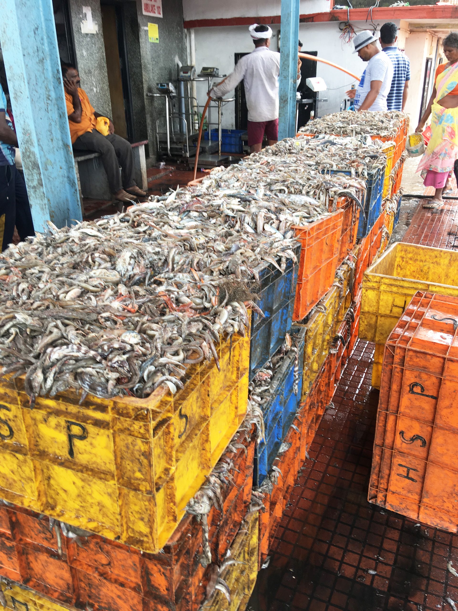 Fish vendors waiting for the sardine catch to be unloaded at Cuddalore, Tamil Nadu. Big boxes of sardines are swiftly unloaded from boats to the shore on the heads of careworn labourers, who blithely pass the baskets along and straight into waiting trucks. Photo Credit: Joeri Scholtens