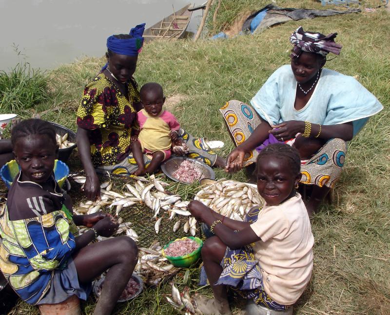 The family sorts fish in Nigeria. Fish can be processed into desirable and affordable nutrient-dense fish products, which can contribute greatly to recommended nutrient intakes (RNIs) for nutritionally vulnerable groups. Photo Credit: Carsten Ten Brink