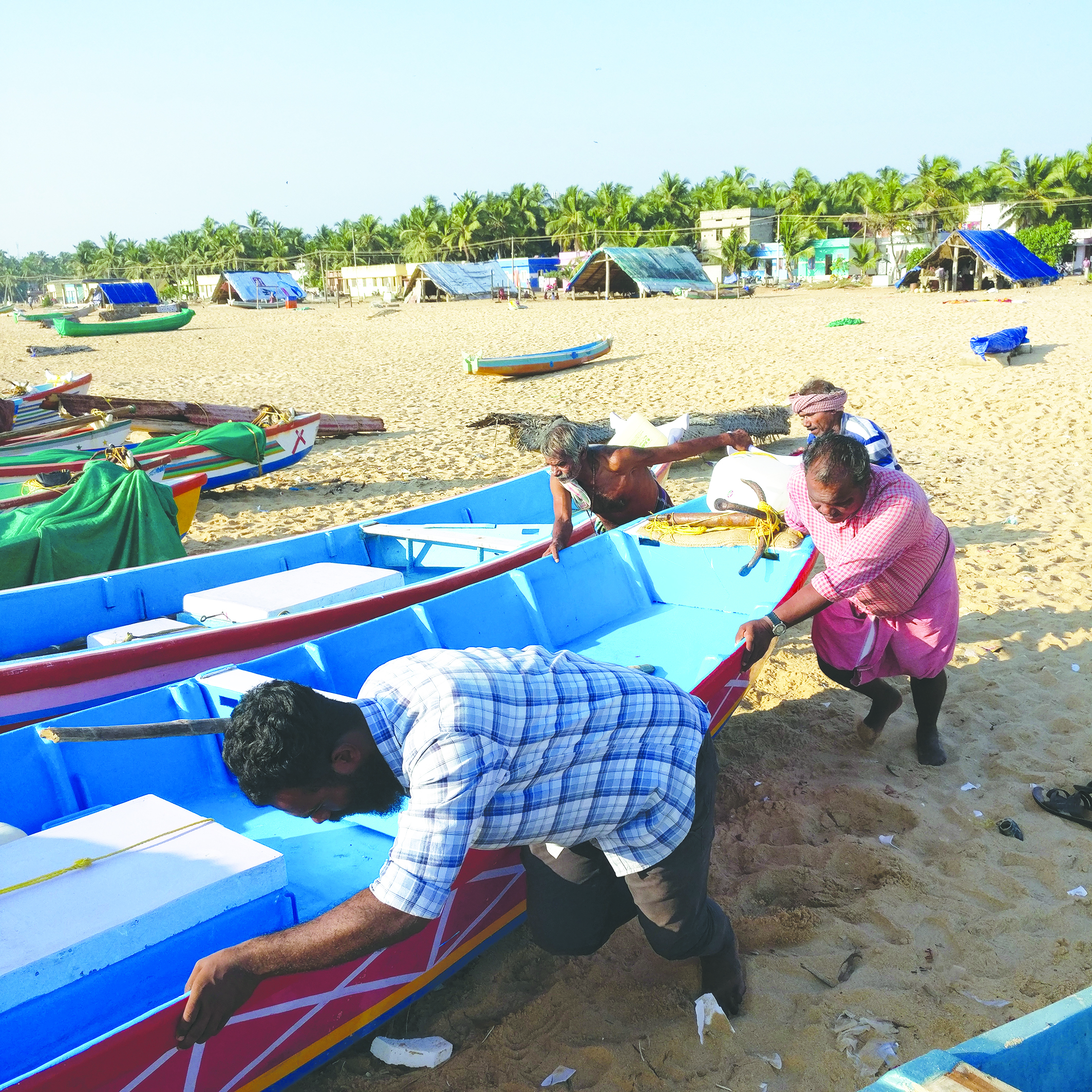 Fishermen preparing for a fishing trip in Karinkulam fishing village,Thiruvananthapuram, Kerala, India. Small-scale fisheries are, after all, the most ‘traditional’ of all sectors in the Blue Economy. Photo Credit: Sebastian Mathew