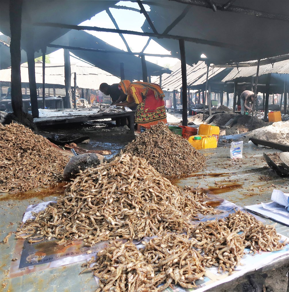 Processing of small pelagic fish in Bagamoyo, Tanzania. The maximum sustainable yield (MSY) for both inland and inshore marine waters stands at about 2.14 mn tonnes per annum; the actual yearly production ranges between 370,000 tonnes and 470,000 tonnes. Photo Credit: EMEDO