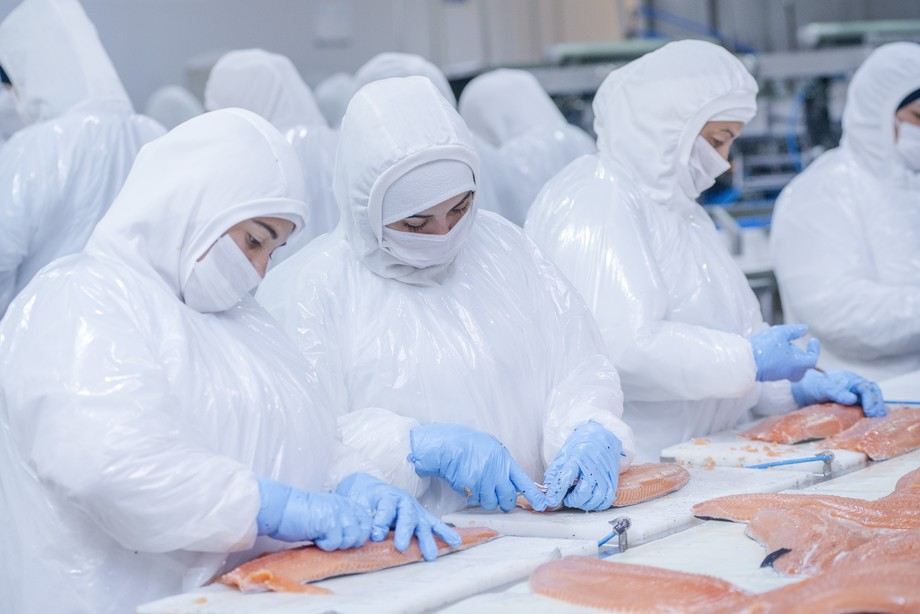 Thirty-three per cent of Chilean salmon workers are women, who constitute nearly half of direct employment in processing plants Chile. They work long hours, standing in cold and humid conditions. Photo Credit: Ecoceanos