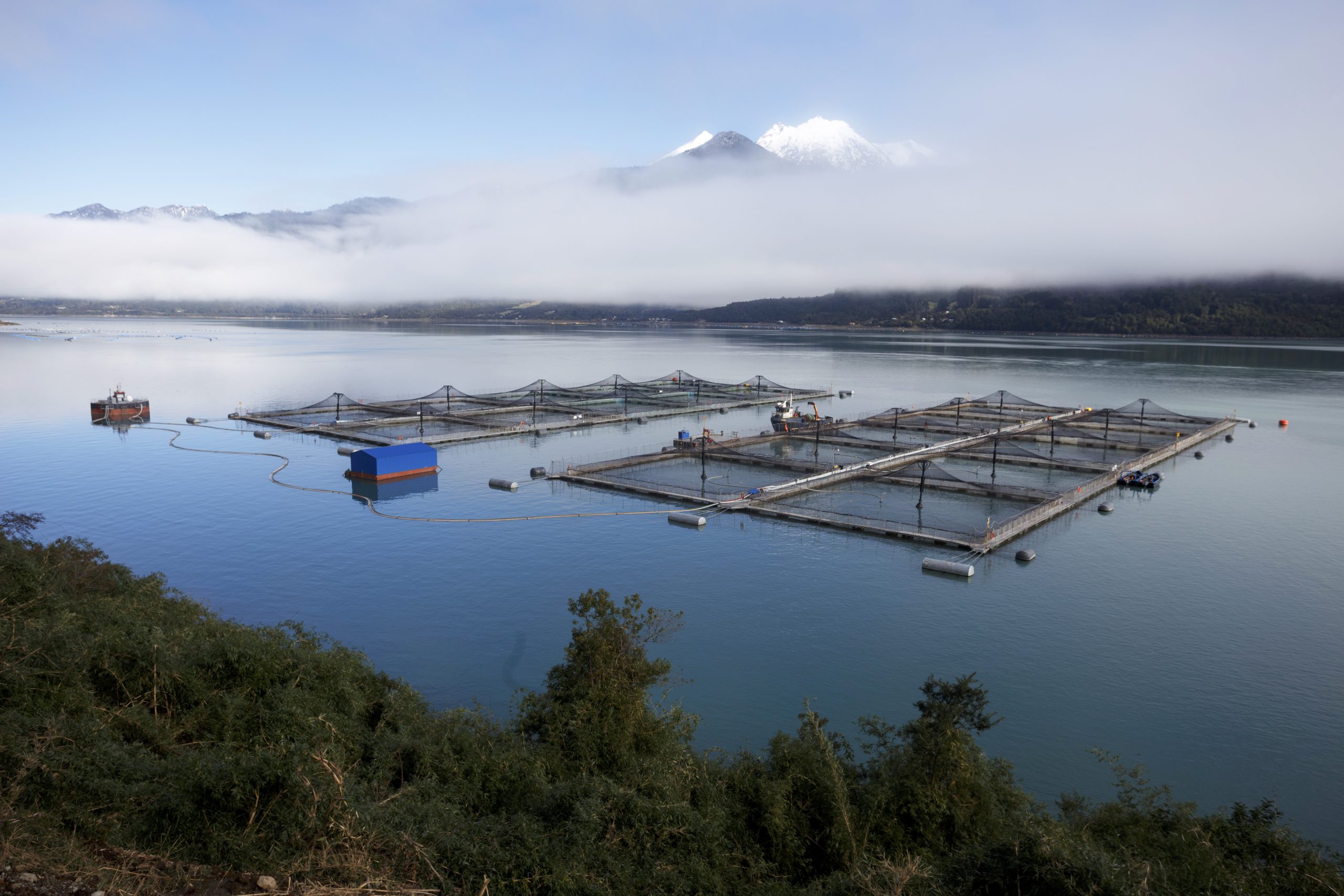 A salmon farm in the Reloncaví estuary in Chile’s Los Lagos region, Chile. The working conditions in the industry are so precarious that more than 60 workers’ deaths were registered between 2013 and 2021. Photo Credit: Wikimedia Commons