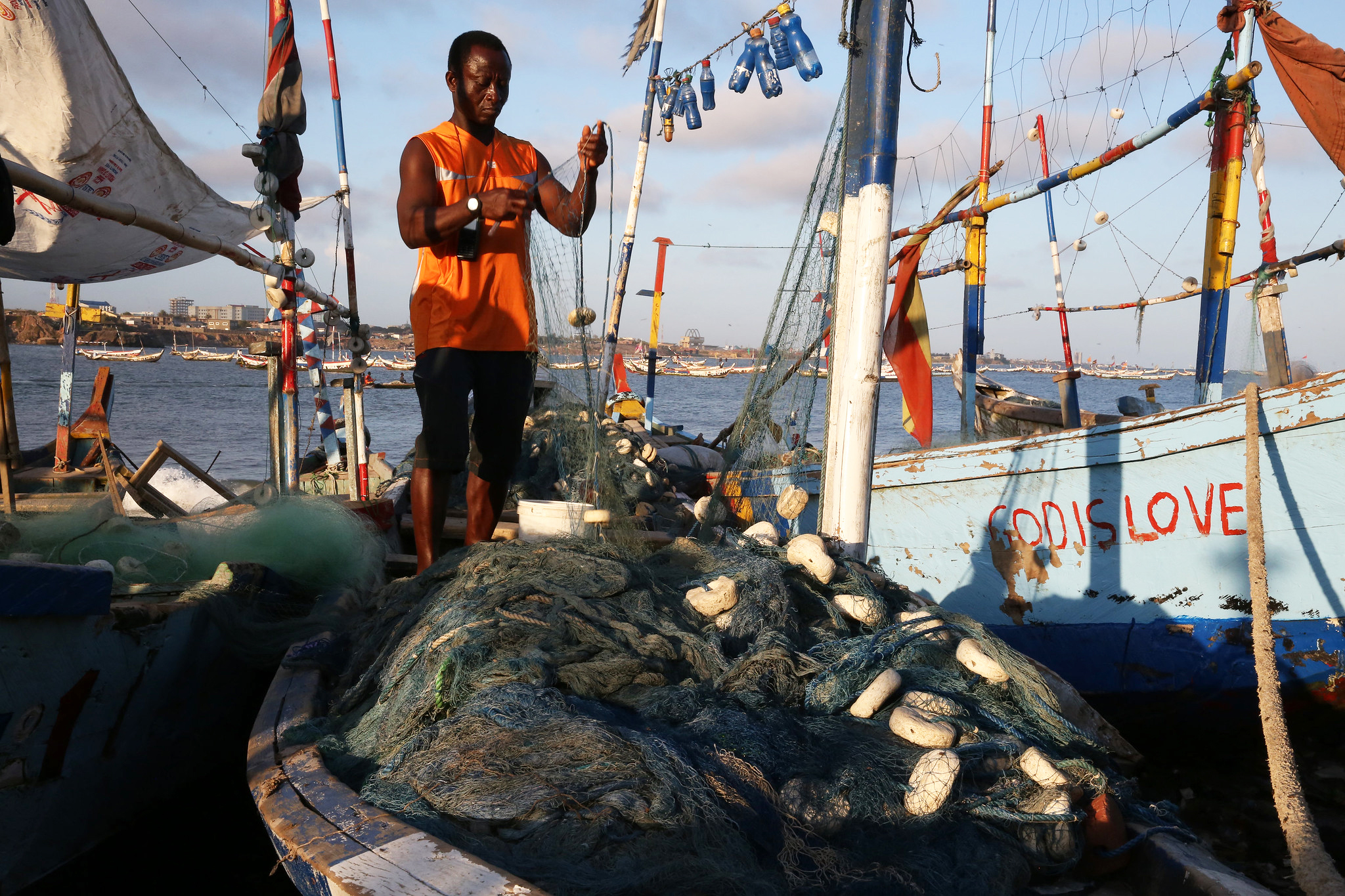 A fisher works on his boat in Accra, Ghana Photo Credit: Dominic Chavez. GNCFC contends that while there are no more than 1,500 saiko operatives, over 140,000 fishers and nearly 3 million traders depend on the small-scale fisheries sector. Photo Credit: Dominic Chavez