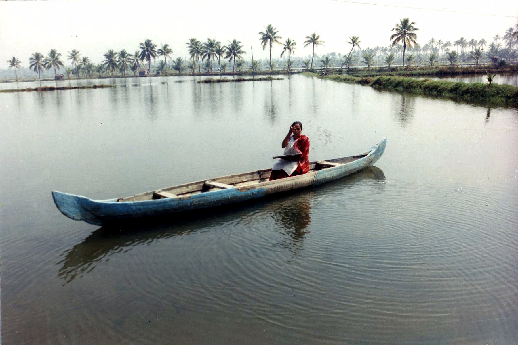 A woman feeding in aquaculture pond, India. Women contribute in almost all activities right from pond preparation, stocking, feeding, and to harvesting.