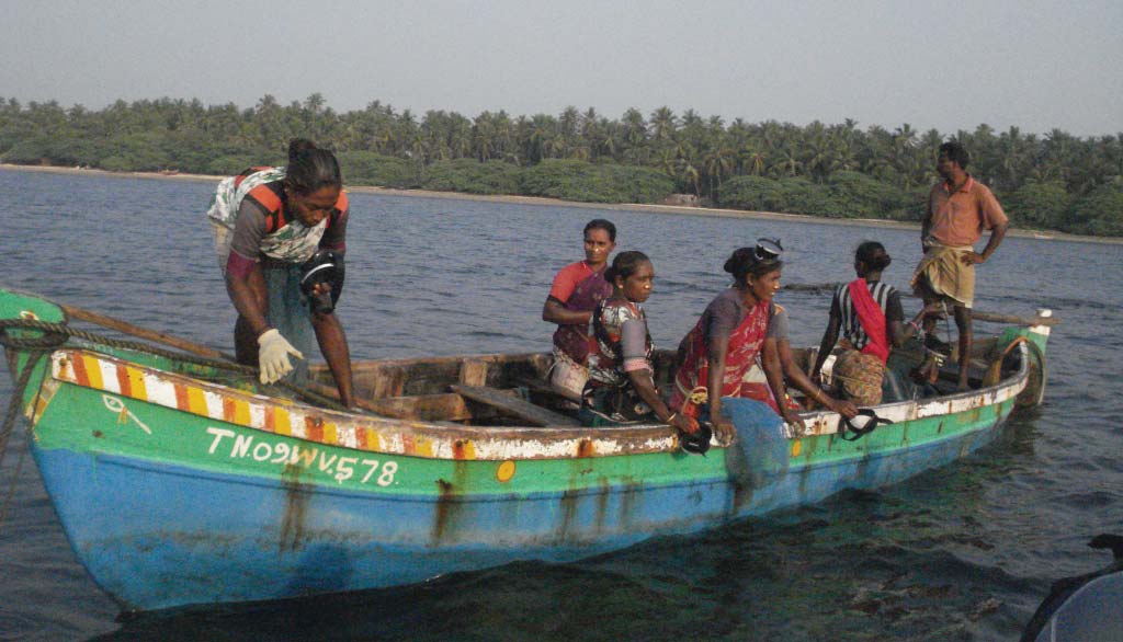 Seaweed collectors in Gulf of Mannar, Tamil Nadu, India. The Government of Tamil Nadu will soon provide identifi cation cards to women seaweed collectors, recognizing this unique group of women fishers.