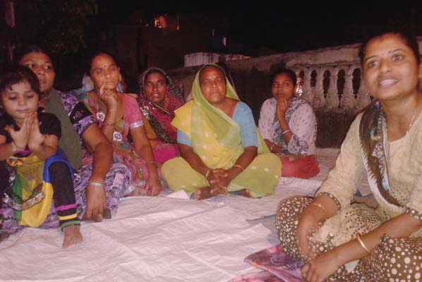 Hansaben with women fi hworkers attending meeting at Veraval, Gujarat, India. Meeting with the women of Jan Jagruti Manch started at nine in the night.