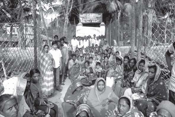 Women of the Mahila Donga Samity and members of the Dakshinbanga Matsyajibi Forum in front of Kultali Forest Range beat office, West Bengal, India.