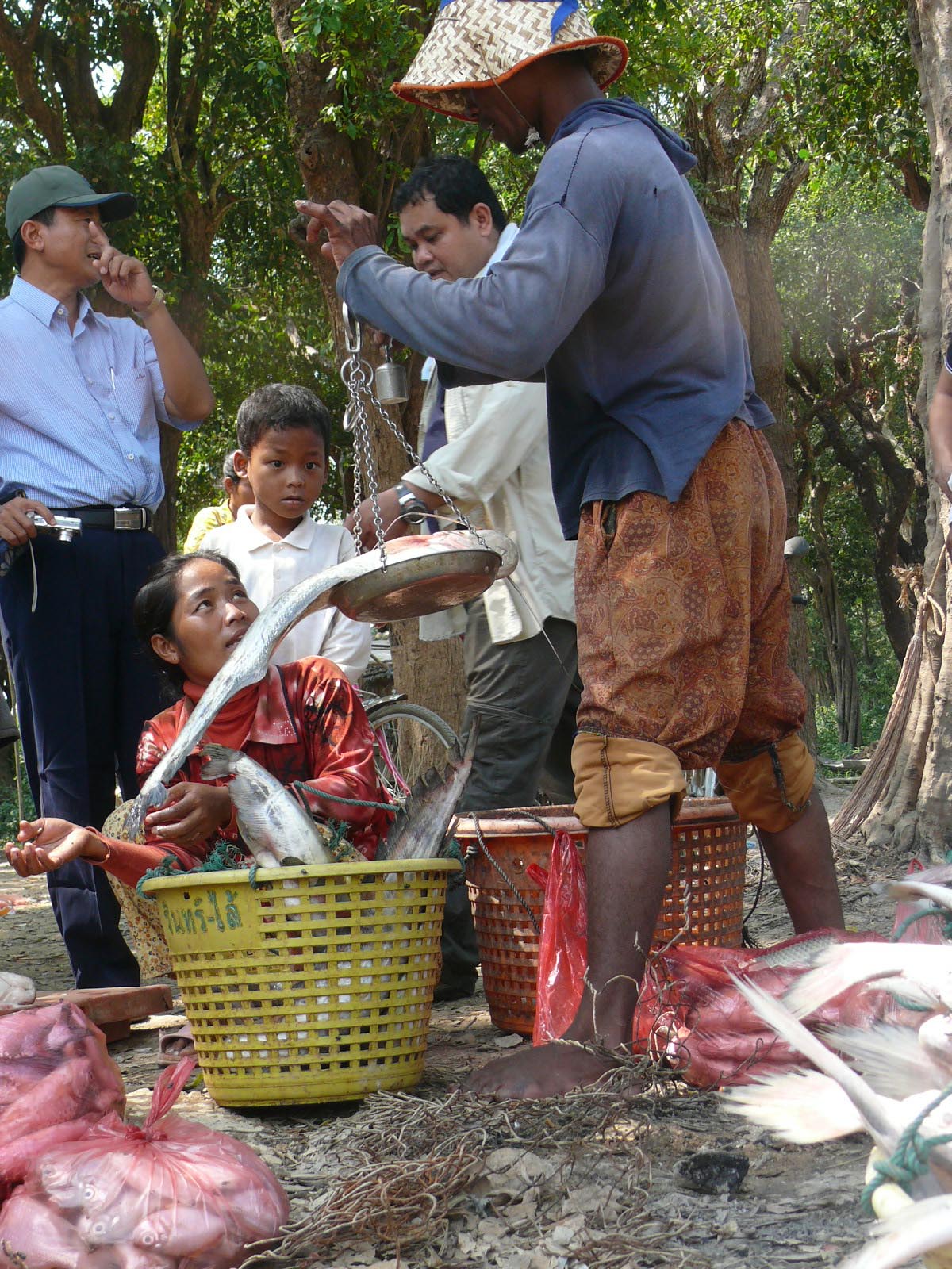 A fish vendor at Kampong Phluk, Cambodia. Women dominated the retail trade of small fish from the Tonle Sap Lake and from rice fields.